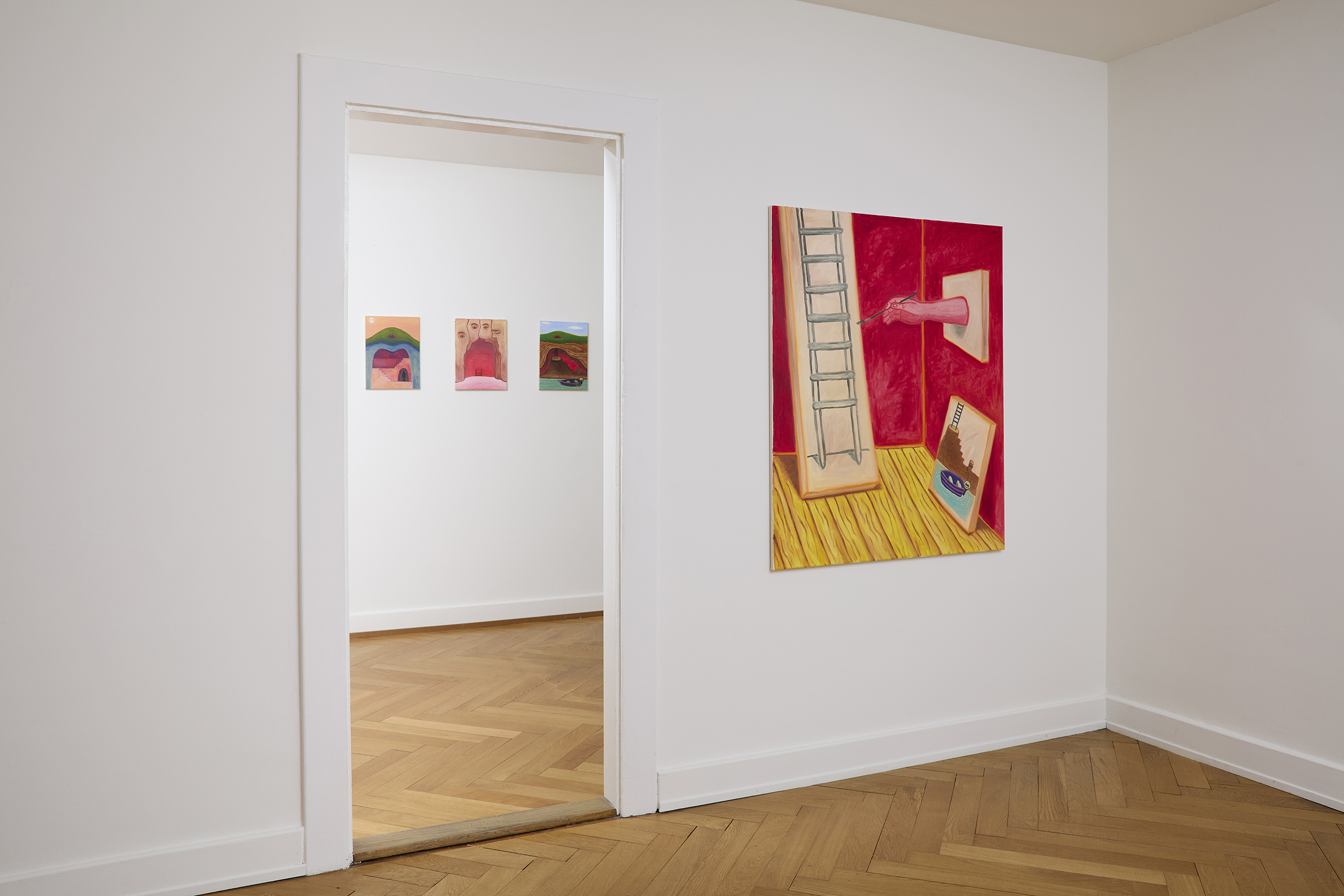 Bildräume öffnen sich wie Eingänge in die Psyche. Verborgene Höhlen sind durchzogen von Zeichen und Spuren, die eine rätselhafte Kommunikation andeuten. Es sind Leitern, Treppen und Eingänge zu sehen, deren Ziel im Unbestimmten bleibt. In anderen Werken treten die Räume selbst in einen Dialog. Aus den Leinwänden treten malende Hände hervor, Arme zeigen in eine Richtung, Beine überschreiten die Grenzen des Bildes und hinter Türen blicken Augen hervor – Körperfragmente, die das Sichtbare mit dem Unsichtbaren verknüpfen.